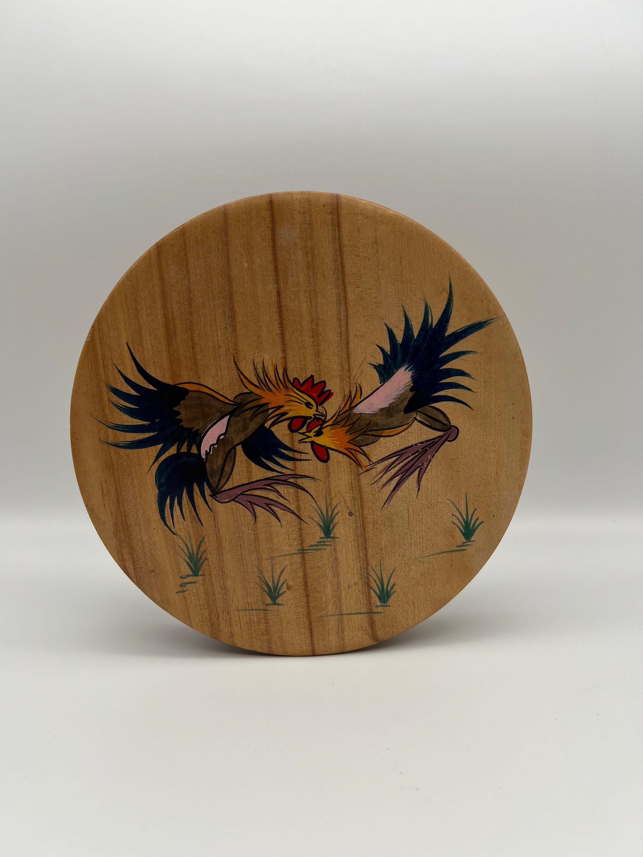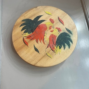 Vintage Round Wooden Hamburger Press With Fighting Roosters Ebay